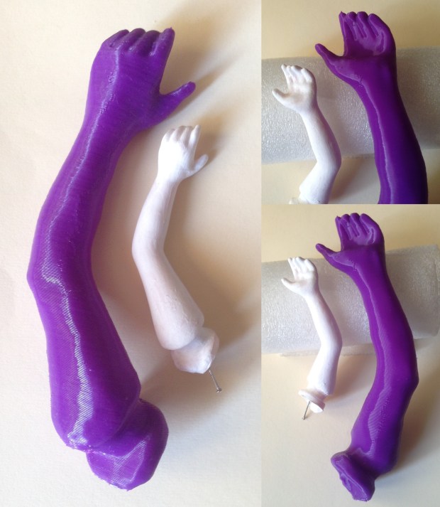 Brazo impreso de la muñeca de plástico. El brazo original es el de menor tamaño. Fotogrametría y PLA.